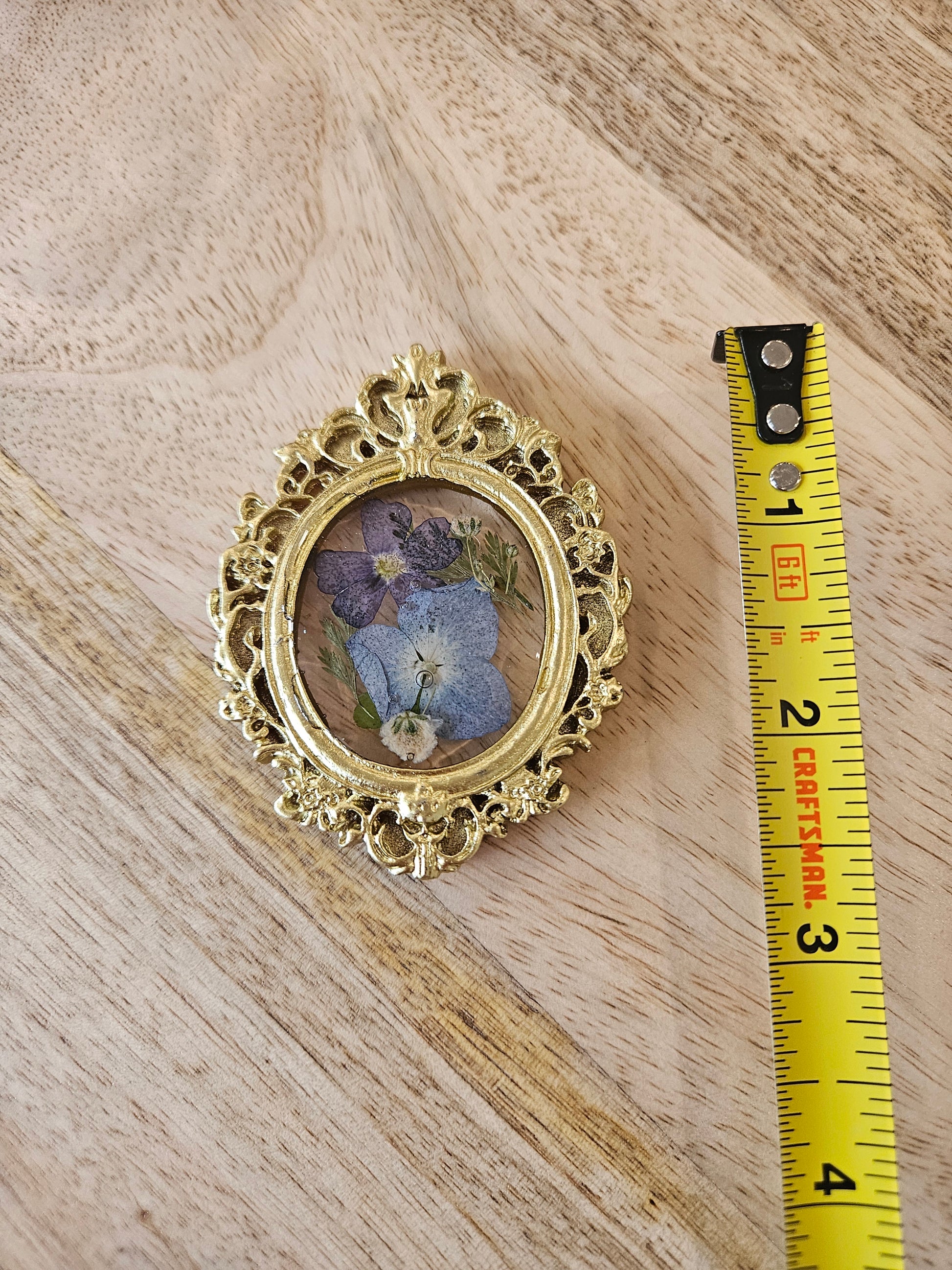 A little frame for a tiny piece of nature. These magnets feature real pressed flowers preserved in clear resin and set within antique-style gold frames, creating a delicate botanical accent with vintage charm.