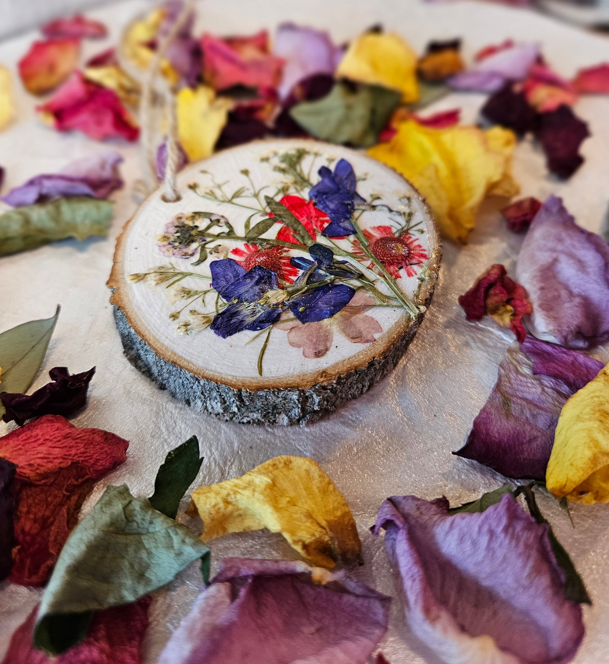 These pressed flower wood ornaments are handmade with real dried flowers and sealed for lasting beauty — perfect for cottage-core homes, rustic holiday trees, and meaningful, nature-inspired gifting.